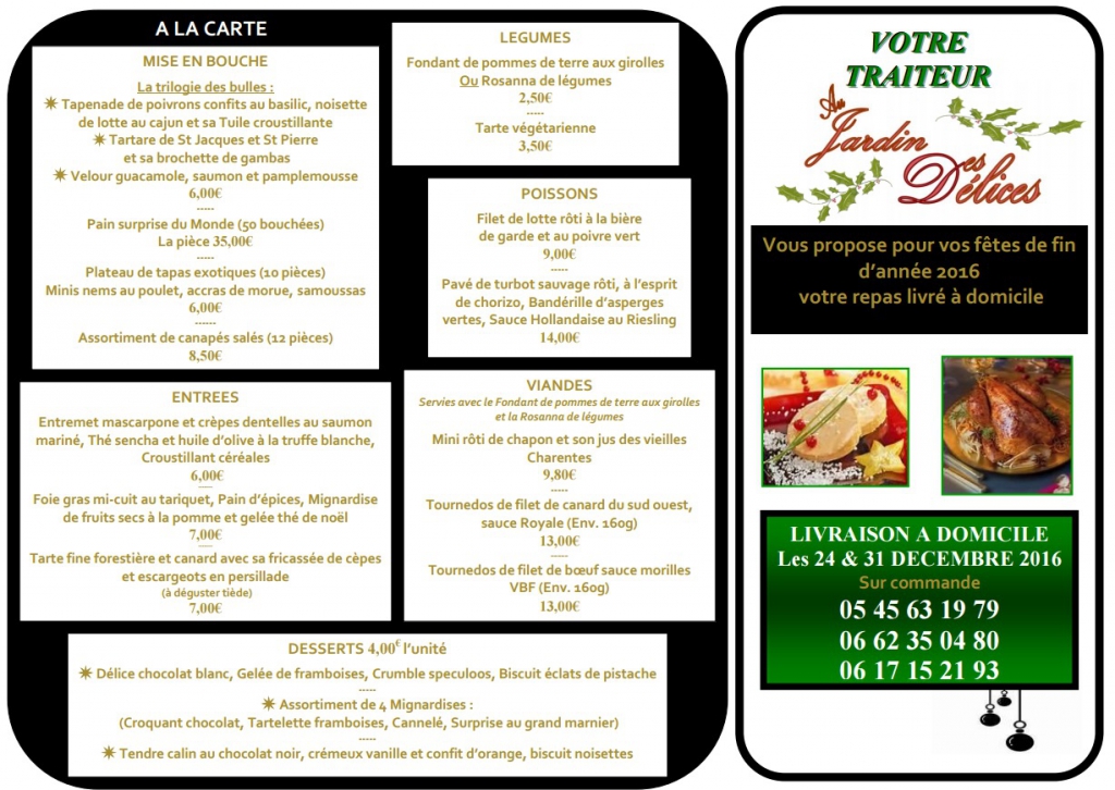 Repas de fin d’année Votre traiteur vous propose pour vos fêtes de fin d’année votre repas livré à domicile